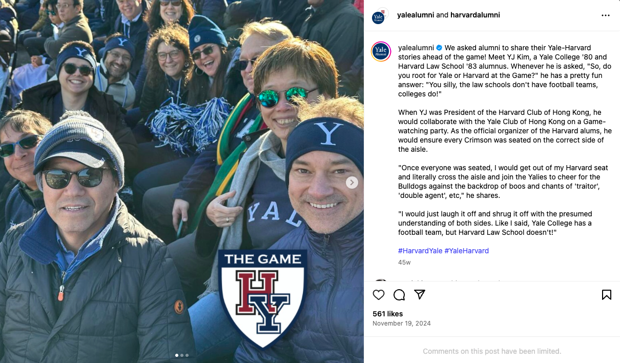 Did you attend both Yale and Harvard? Are you and your significant other from opposite schools? Do you have a strong connection or friendship with someone from Harvard? If you have a Yale-Harvard story you'd like to share, fill out this form for a chance to have your story featured on YAA and HAA socials leading up to The Game in November!